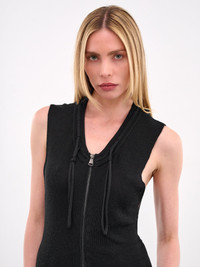 AYA MUSE tank in black, silk-cashmere blend, paneled knit construction, rib-knit, plunged neckline, collar knot drawstring, front exposed two-way zip closure, sleeveless, armscyes, straight hem, slim fit. Made in China 85% Silk 15% Cashmere Standard Sizing Model is 5'8" wearing size S. Bust: 32" Waist: 24" Hips: 35"
