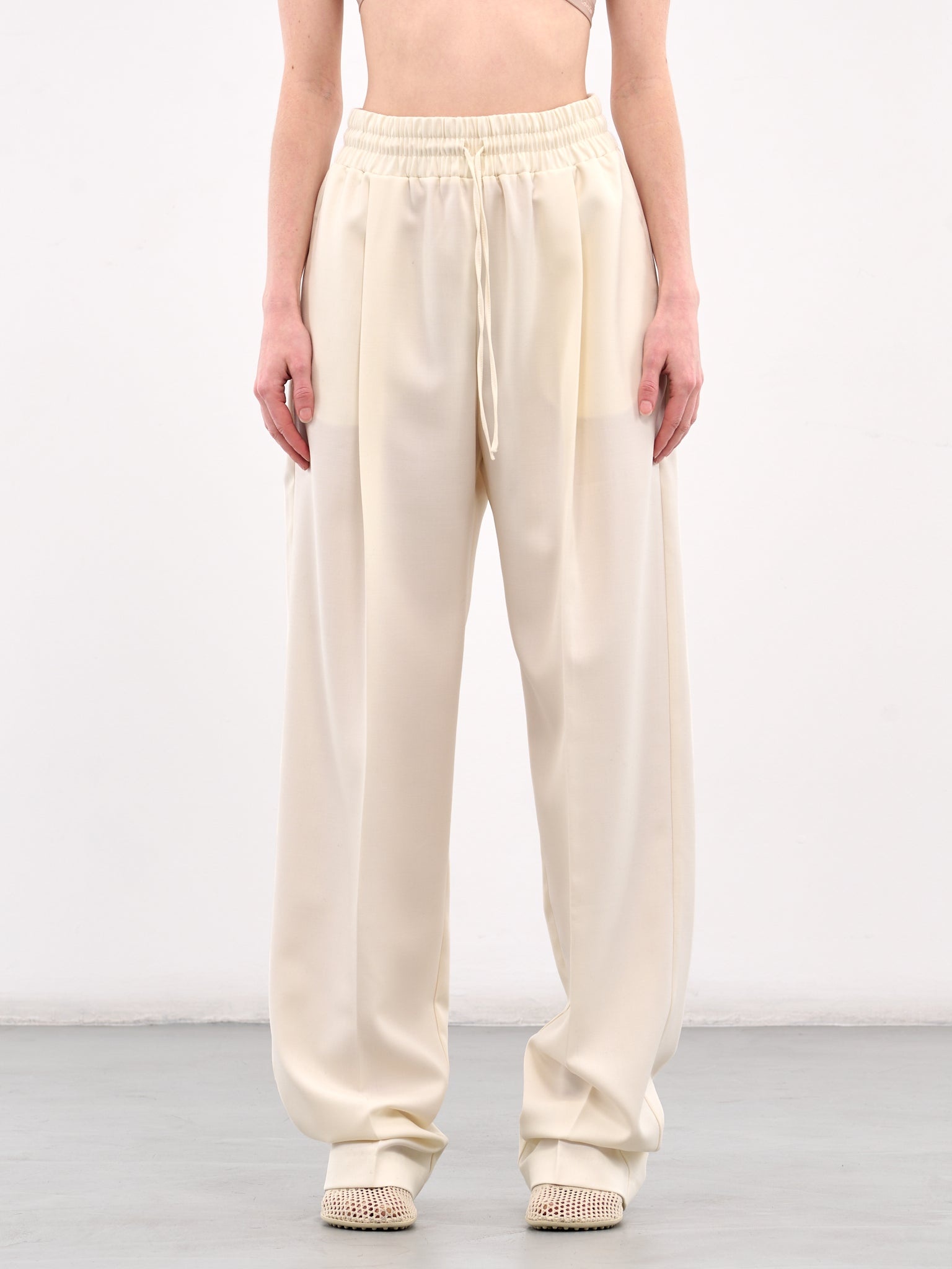 AYA MUSE trousers in off-white, wool-poly blend, paneled construction, high waist, elasticated waistband, adjustable drawstring, pleated, side pockets, back welt pocket, wide leg, relaxed fit. Made in China 50% Wool 50% Polyester Standard Sizing Model is 5'6" wearing size S. Bust: 30" Waist: 24" Hips: 36"
