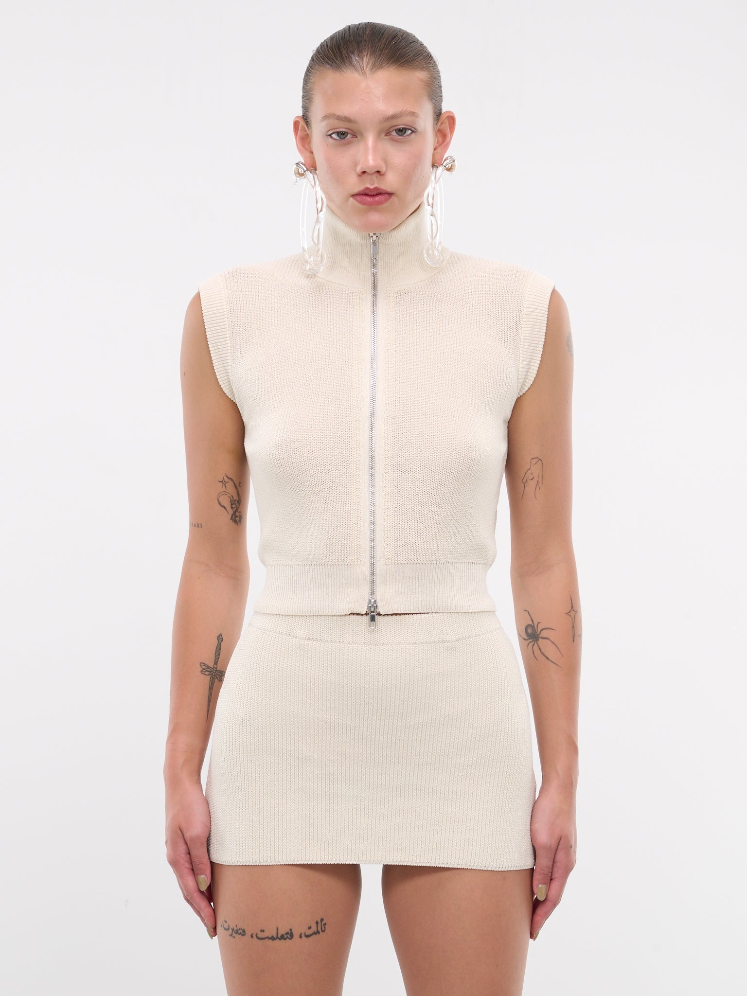 AYA MUSE vest in white, cotton-nylon blend, paneled knit construction, turtleneck, front exposed two-way zip closure, sleeveless, rib-knit collar & armscyes & hem, straight hem, slim fit. Made in China 75% Cotton 25% Polyamide Standard Sizing
