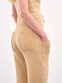 AYA MUSE trousers in butter, cotton-nylon blend, paneled knit construction, ribbed waistband, front concealed zip fly closure, back patch pockets, front deep patch pockets, rib-knit hems, straight leg, relaxed fit. Made in China 90% Cotton 9% Nylon 1% Elastane Standard Sizing Model is 5'8" wearing size S. Bust: 32" Waist: 24" Hips: 35"