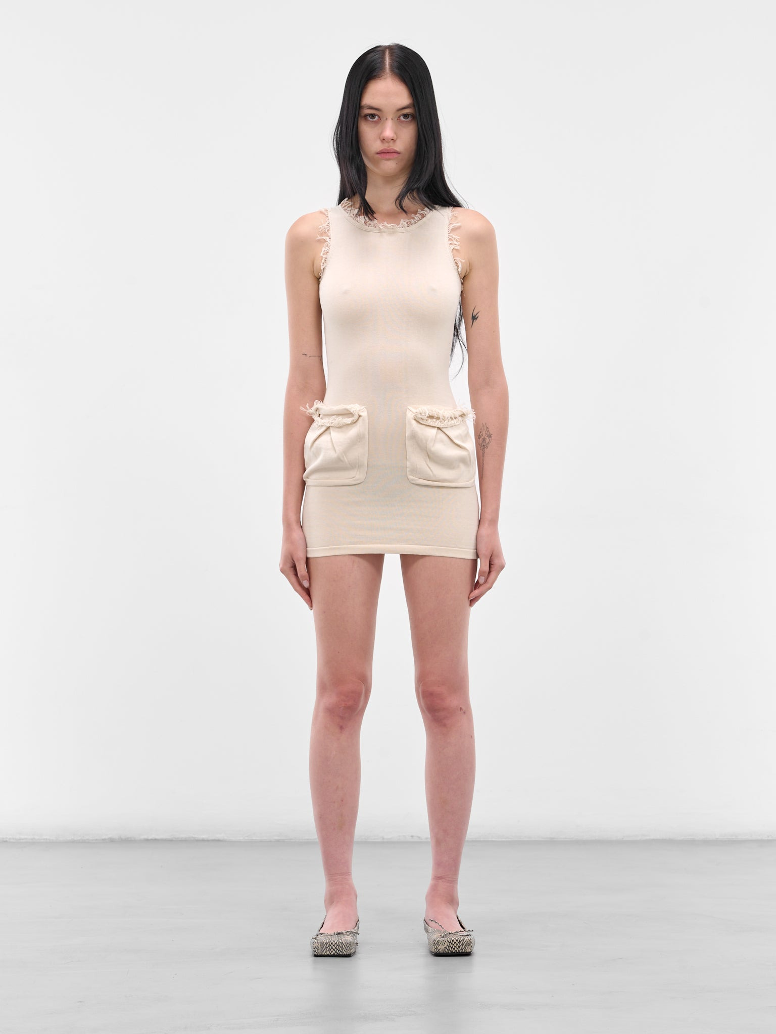 The off-white Fleur Mini Dress features frayed edges and cargo pockets at the hips, adding utilitarian texture to its slim, sleeveless silhouette. Featuring: • Slim fit • Round neck with shoulder straps • Sleeveless with armholes • Frayed edges • Cargo pockets at hips • Mini-length • Made in China • 55% Silk 45% Cotton • Standard sizing Model is 5'8" wearing size S. Bust: 28.5" Waist: 22.5" Hips: 33.5"