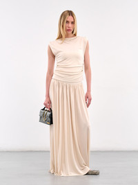 AYA MUSE top in off-white, paneled viscose construction, boat neck, shoulder ruching, sleeveless, armscyes, side ruching & gathering, curved hem, slim fit. Made in Portugal 100% Viscose Standard Sizing Model is 5'8" wearing size S. Bust: 32" Waist: 24" Hips: 35"