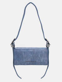 BENEDETTA BRUZZICHES blue handbag, handmade, Nappa leather construction, trompe l'oeil denim pattern, adjustable shoulder strap, rhinestone-encrusted buckles, magnetic flap closure, back branded logo, lined. Made in Italy Outer: 100% Nappa Leather Inner: 100% Silk Satin One Size