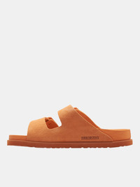 1774 BIRKENSTOCK sandals in kurkuma, signature Arizona sandal design, suede construction, slip-on, two-strap style, adjustable pin-buckle & straps, debossed logo, open round toe, anatomical leather-covered cork-latex footbed, footbed embossed logo, EVA outsole, dust bag included. Made in Germany Upper: Suede Footbed: Leather-Covered Cork-Latex Outsole: EVA European Sizing