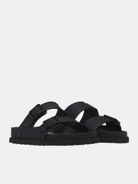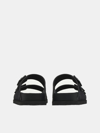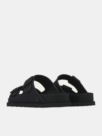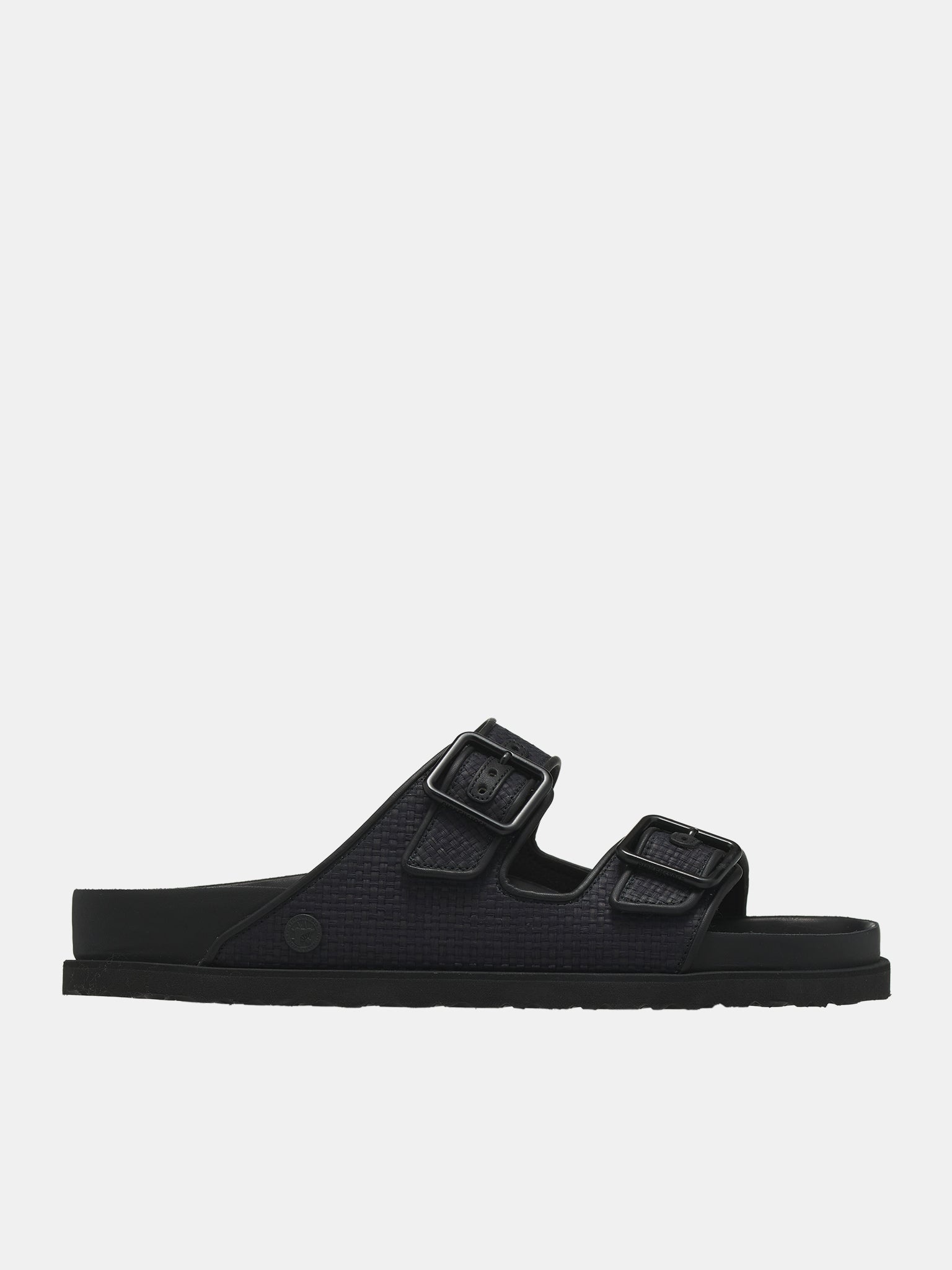1774 BIRKENSTOCK sandals in black, signature Arizona sandal design, leather construction, raffia leather pattern, slip-on, two-strap style, adjustable pin-buckle & straps, debossed logo, rubber logo patch, open round toe, anatomical leather-covered cork-latex footbed, footbed embossed logo, EVA outsole, dust bag included. Made in Germany Upper: Leather Footbed: Leather-Covered Cork-Latex Outsole: EVA European Sizing