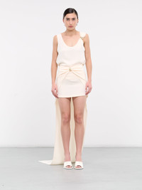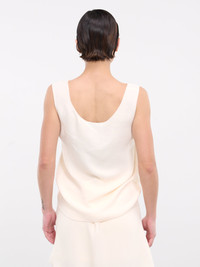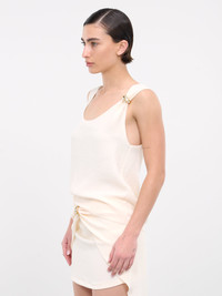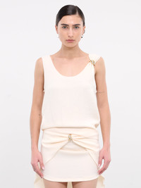 BLUMARINE top in white, paneled polyester construction, scoop neck, shoulder straps, rhinestone-encrusted gold-tone ring hardware, sleeveless, armscyes, straight hem, relaxed fit. Made in Italy 100% Polyester Italian Sizing Model is 5'7" wearing size 38. Bust: 31" Waist: 24" Hips: 30"