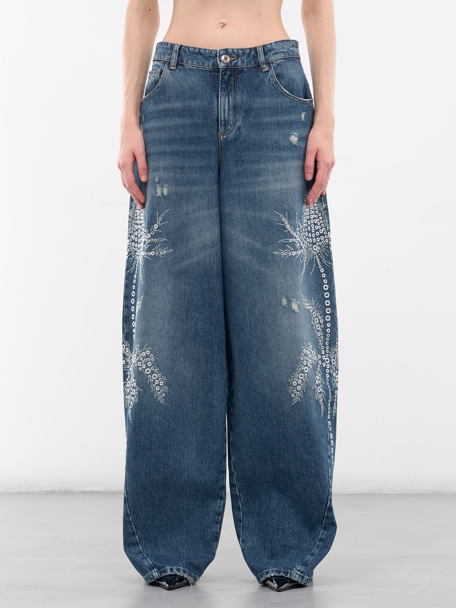 Medium wash denim jeans with a baggy cut and all-over stud and metal eyelet embroidery for textured embellishment. Featuring: • Oversized fit • Medium wash denim • Stud and metal eyelet embroidery • Five pockets • Belt loops • Button and zip closure • Composition: 100% Cotton • Italian sizing Model is 5'9" wearing size 38. Bust: 32" Waist: 25" Hips: 34"