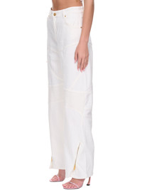 BLUMARINE jeans in white, biker design, denim construction, mid-waist, belt loops, button zip-fly, five-pockets, knee patch, asymmetric cuff zip, wide leg, regular fit. Made in Italy Italian Sizing 98% Cotton, 2% Elastane Model is 5'9" wearing size 38. Bust: 32" Waist: 24" Hip: 35.5"