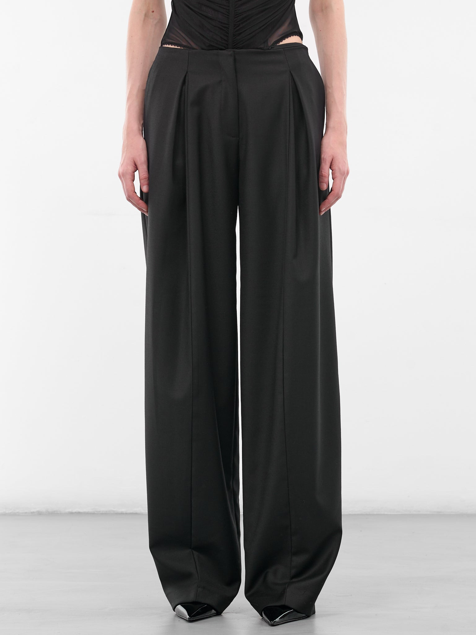 Black Wool Pleated Wide Trousers