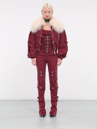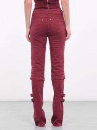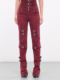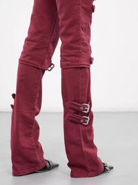 BLUMARINE red pants, boyfriend design, buckled decor & cut-outs, bull denim, vintage-effect, mid-waist, belt loops, button & zip-fly, five pockets, embroidered logo patch, regular fit. 98% Cotton, 2% Elastane Italian Sizing Model is 5'9" wearing size 38. Bust: 32" Waist: 24" Hips: 34"