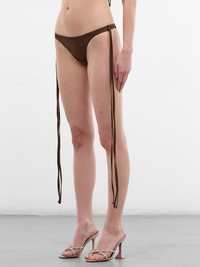 Bikini bottom in brown constructed from nylon jersey with rhinestone embellishment. Featuring: • Slim fit • Nylon jersey construction • Low waist • Elongated self-tie straps at sides • Rhinestone encrusted logo at back • Lined • Low-cut • Made in Italy • Main: 82% Polyamide 18% Elastane | Lining: 80% Polyamide 20% Elastane | Embellishment: 100% Glass • Standard sizing Model is 5'8" wearing size S. Bust: 32” Waist: 25” Hips: 35”