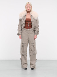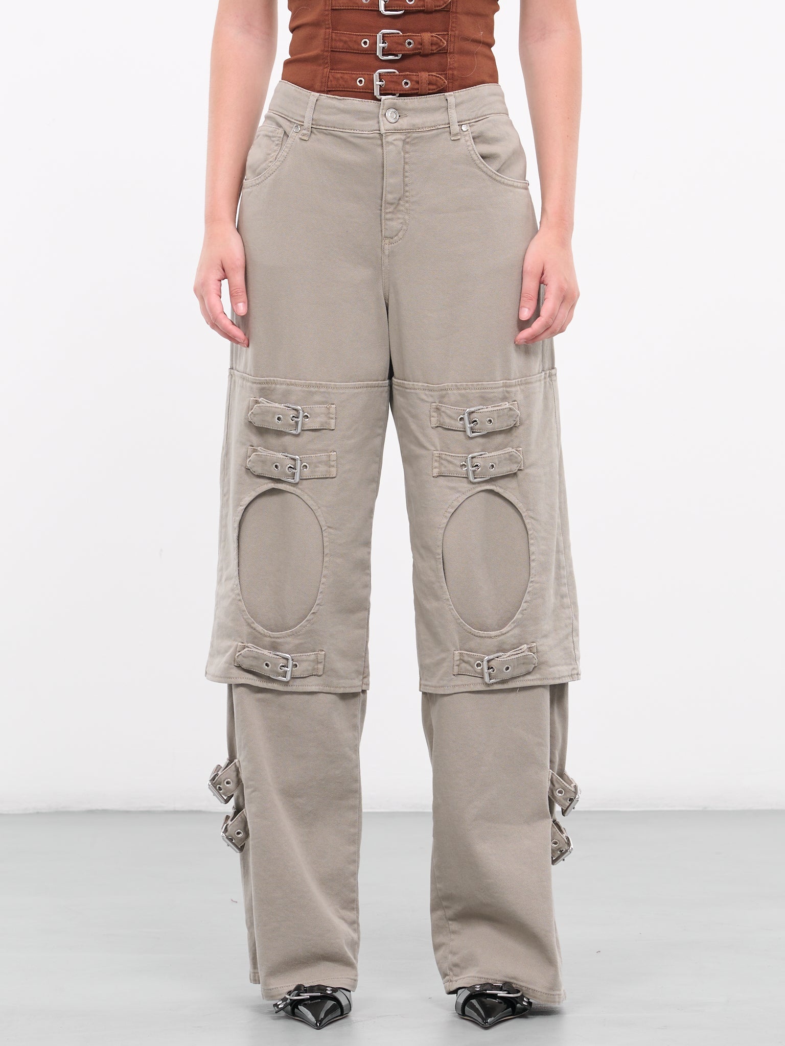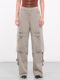 BLUMARINE beige pants, boyfriend design, buckled decor & cut-outs, bull denim, vintage-effect, mid-waist, belt loops, button & zip-fly, five pockets, embroidered logo patch, regular fit. 98% Cotton, 2% Elastane Italian Sizing Model is 5'9" wearing size 40. Bust: 32" Waist: 24" Hips: 34"