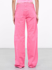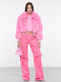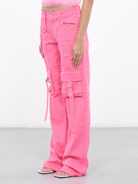 BLUMARINE pink pants, cargo design, bull denim, vintage treatment, low waist, belt loops, button & zip-fly, five pockets, flap pockets, strap buckle fastenings, logo embroidered jacron patch, puddle bottom, full length, straight leg, regular fit. Made in Italy 98% Cotton, 2% Elastane Italian Sizing Model is 5'8" wearing size 42. Bust: 32" Waist: 26" Hips: 34.5"