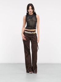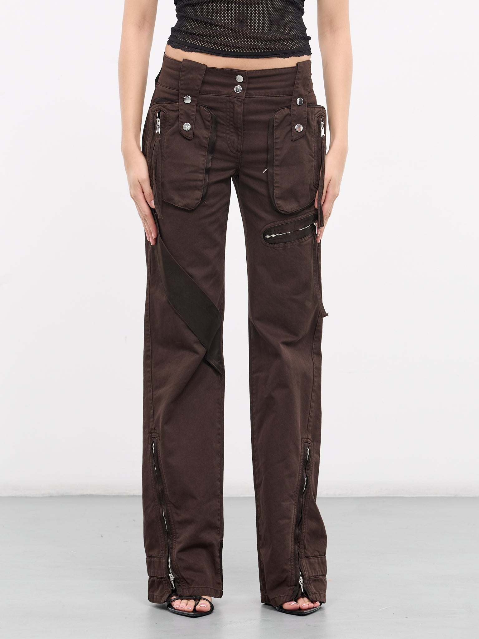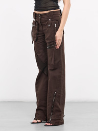 BLUMARINE trousers in brown, utilitarian cargo design, paneled cotton bull construction, belt loops, back logo embroidery, front button & concealed zip fly closure, front zip cargo pockets, front zip pocket, cuff zip vents & press-stud adjustable strap, straight leg, regular fit. 100% Cotton Italian Sizing Model is 5'8" wearing size 38. Bust: 32" Waist: 26" Hips: 34.5"
