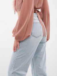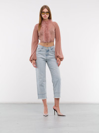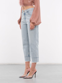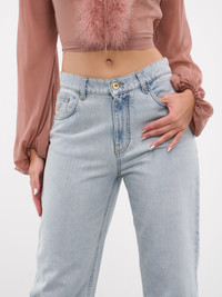 BLUMARINE pants in blue, paneled denim construction, mid waist, belt loops, back removed patch detailing, inset pockets, coin pocket & logo embroidery, back patch pockets & logo flag, raw hem, cropped length, straight leg, regular fit. Made in Albania Fabric 1: 100% Cotton Fabric 2: 65% Polyester 35% Cotton European Sizing Model is 5'10" wearing size 40. Bust: 33" Waist: 23.5" Hips: 35.5"