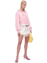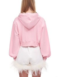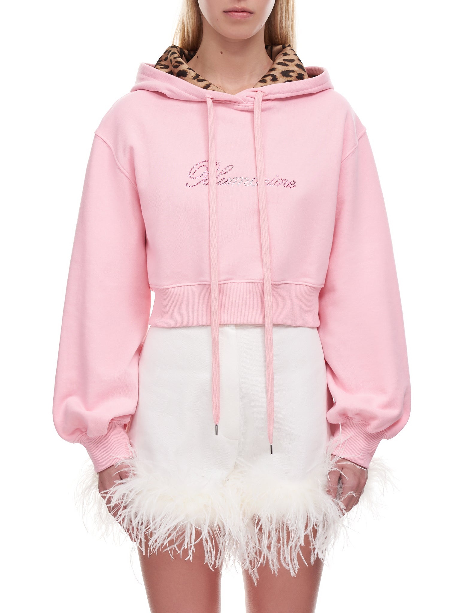 Blumarine sweatshirt in pink, attached hood with adjustable drawstring, long sleeves, rhinestone applique text center chest, ribbed hem and cuffs, kangaroo pocket. Made in Italy. Composition: (Main) 100% Cotton, (Lining) 100% Polyester. Standard XS-L Sizing. Model Measurements: Model is 5ft 9” and wearing a size XS. Bust: 29” Waist: 22” Hip: 33"