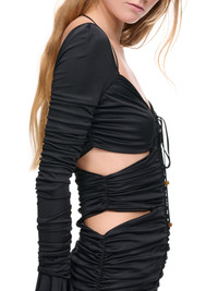 BLUMARINE dress in black, draped design, halter neck tie, front tie strap fastening, gold-tone metal knot clips, long sleeves with corolla cuffs, side cut-outs, back zip fastening, lined, fitted. Italian Sizing Composition: 100% Viscose Model is 5'9" and is wearing size 38. Bust: 32" Waist: 24" Hip: 34"