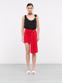 BLUMARINE skirt in red, paneled stretch viscose construction, fitted waist, back concealed zip closure, front gathering & draped sash, gold-tone ring hardware, straight hem, mini-length, slim fit. Made in Italy 93% Viscose 7% Elastane Italian Sizing Model is 5'7" wearing size 40. Bust: 31" Waist: 24" Hips: 30"