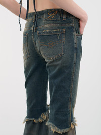 BLUMARINE pants in navy, paneled design, flared silhouette, denim & chiffon construction, frayed hem, low waist, button & zip-fly fastening, five-pockets, jacron patch, slim fit. Italian Sizing 98% Cotton, 2% Elastane Model is 5'9" wearing size 40. Bust: 31.5" Waist: 23" Hips: 34"