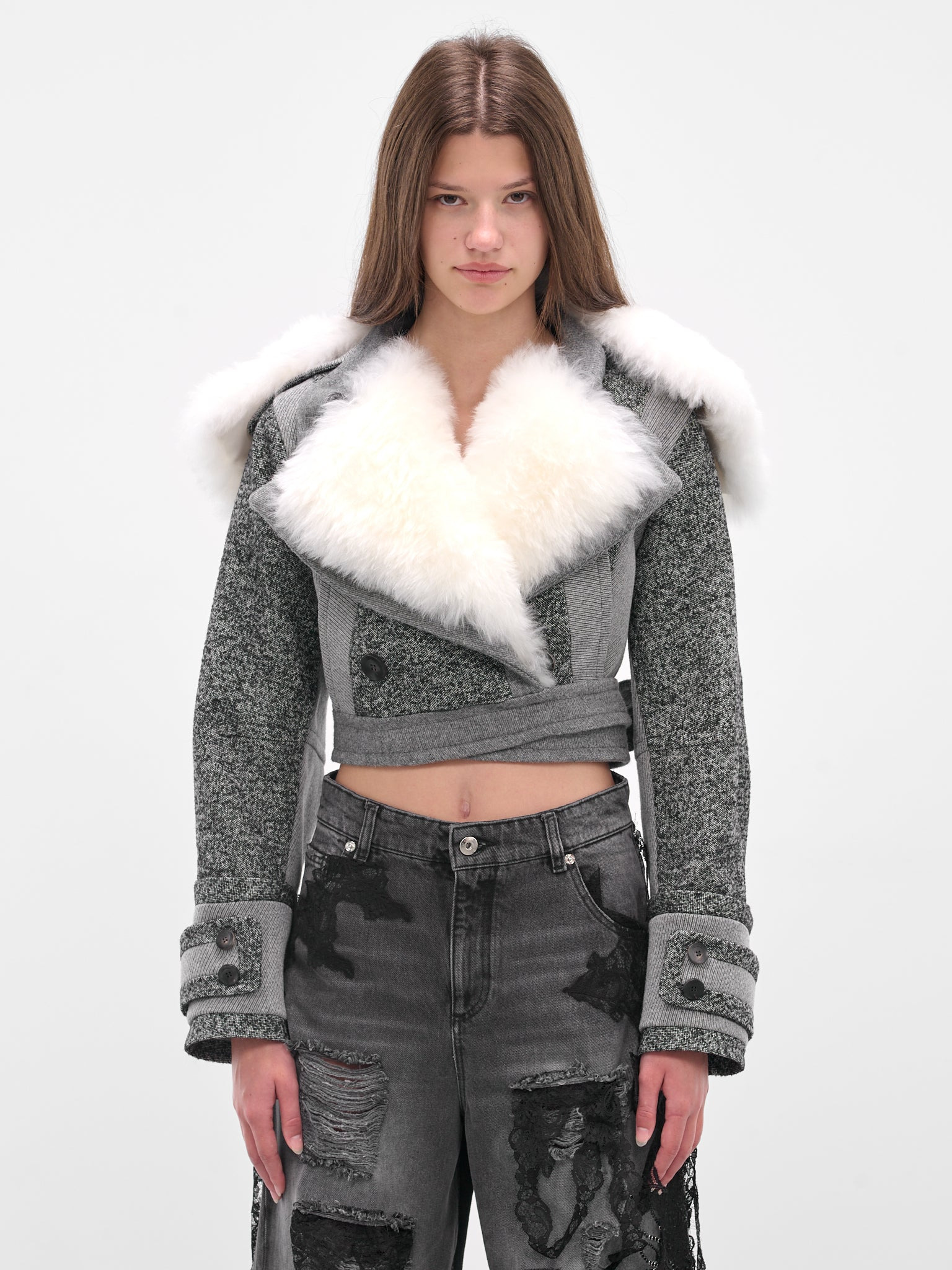This gray cropped shearling jacket is constructed with contrast panels and rib-knit trim, anchored by a goat fur-trimmed collar and cape. Notched lapel, double-breasted closure, and a self-tie belt sharpen the slim, architectural cut. Featuring: • Slim fit • Cropped length with self-tie belt at waist • Contrast paneled construction and rib-knit trim • Notched lapel and double-breasted closure • Goat fur embellished collar and cape • Long sleeves with adjustable cuffs • Made in Italy • Main: 60% Wool 30% Polyester 6% Polyamide 4% Other Fiber | Secondary: 51% Wool 18% Polyester 14% Acrylic 14% Polyamide 3% Other Fiber | Fur: 100% Goat • Italian sizing Model is 5'9" wearing size 40. Bust: 33.5" Waist: 25" Hips: 35"