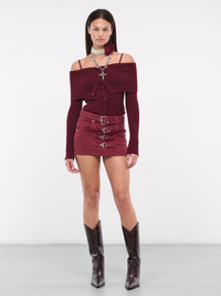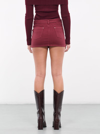 BLUMARINE red skirt, denim construction, decor straps & buckles, low waist, detachable belt, button & zip-fly, five pockets, branded jacron patch, mini length, fitted. 98% Cotton, 2% Elastane Italian Sizing Model is 5'10" wearing size 38. Bust: 32" Waist: 24" Hips: 36"