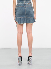 BLUMARINE blue skirt, denim construction, vintage treatment, low waist, belt loops, button & zip-fly, cargo pockets, buckle & strap closure, asymmetric flounce back, logo embroidered jacron patch, partial fringe hem, mini length, slim fit. Made in Italy 98% Cotton, 2% Elastane Italian Sizing Model is 5'8" wearing size 38. Bust: 32" Waist: 26" Hips: 34.5"