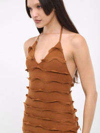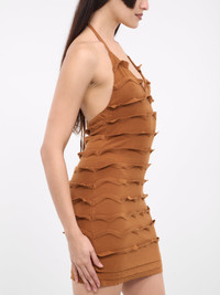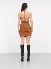 BLUMARINE dress in brown, knit viscose-polyester construction, wavy trim pattern, halterneck, back self-tie fastening, plunging v-neck, open back, straight hem, mini-length, slim fit. Made in Italy 70% Viscose 30% Polyester Standard Sizing Model is 5'8" wearing size S. Bust: 32" Waist: 26" Hips: 34.5"