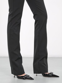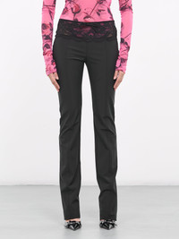 BLUMARINE trousers in black, paneled stretch polyester construction, low-rise, scalloped lace flounce waist, self-tie detailing, concealed side zip closure, relief seams, flared leg, slim fit. Made in Italy Outer: 95% Polyester 5% Elastane Insert: 50% Polyester 50% Polyamide European Sizing Model is 5'8" wearing size 40. Bust: 32" Waist: 26" Hips: 34.5"