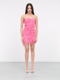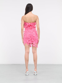 BLUMARINE dress in pink, corset dress design, paneled tulle construction, laser-cut rose appliqués throughout, straight neckline, open back, strapless, back concealed zip closure, side boning, scalloped hem, mini-length, slim fit. Made in Italy Outer: 84% Polyamide 16% Elastane Application: 100% Polyester European Sizing Model is 5'8" wearing size 40. Bust: 32" Waist: 26" Hips: 34.5"
