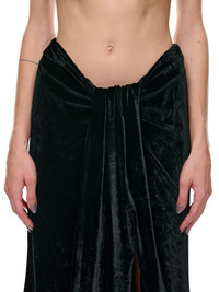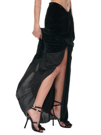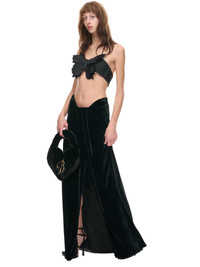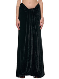 BLUMARINE skirt in black, soft velvet construction, knot & draped design, mid-waist, back zip closure, short train, long length, lined, relaxed fit. Made in Italy Italian Sizing 74% Viscose, 23% Silk, 3% Elastane Model is 5'9" wearing size 40. Bust: 33" Waist: 24" Hip: 33"