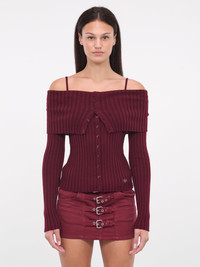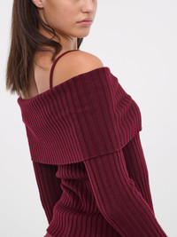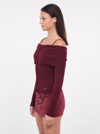 BLUMARINE red sweater, off-shoulder design, ribbed wool, wide lapel collar, thin shoulder straps, logo plaque, slim fit. 100% Wool Standard Sizing Model is 5'10" wearing size S. Bust: 32" Waist: 24" Hips: 36"