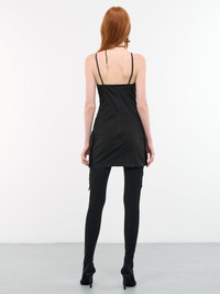 BLUMARINE dress in black, cargo design, over-dyeddelavé canvas, straight neckline, spaghetti straps, bellows pockets, eyelet flaps, concealed back zip closure, mini length, fitted. Made in Italy Italian Sizing 97% Cotton, 3% Elastane Model is 5'9" wearing size 40. Bust: 31.5" Waist: 23" Hips: 34"