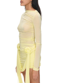BLUMARINE top in yellow, pleated design, viscose jersey, semi-sheer, boat neckline, elongated sleeves, lettuce-edge, fitted. Made in Italy Italian Sizing 100% Viscose Model is 5'10" wearing size 40. Bust: 32" Waist: 25" Hips: 35"