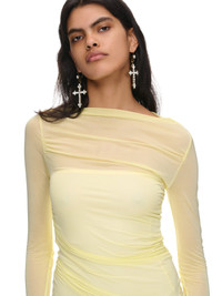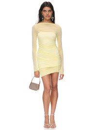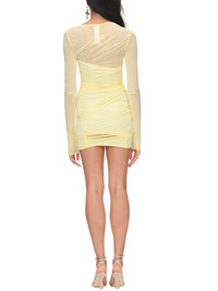 BLUMARINE dress in yellow, pleated design, viscose jersey, semi-sheer, boat neckline, elongated sleeves, lettuce-edge, mini length, fitted. Made in Italy Italian Sizing 100% Viscose Model is 5'10" wearing size 40. Bust: 32" Waist: 25" Hips: 35"
