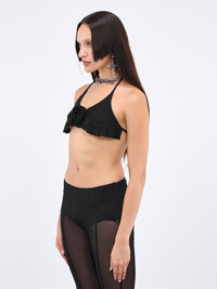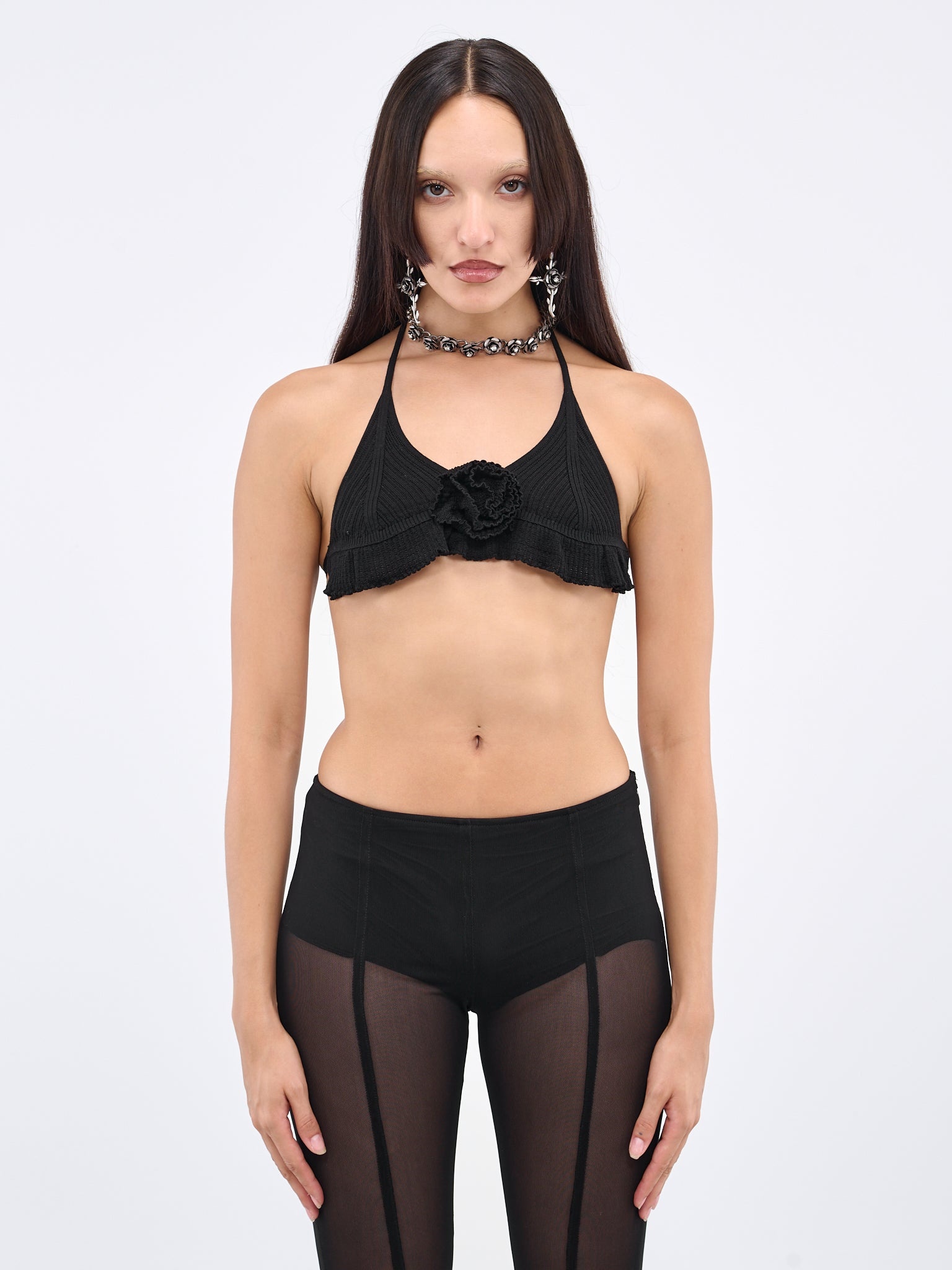 BLUMARINE top in black, bra design, a-jour rib knit wool, ruffle trim, 3D rose appliqué, scoop halter neck & waist strap, button fastening, back embroidered logo, slim fit. Made in Italy 100% Wool Standard Sizing Model is 5'8" wearing size S. Bust: 32" Waist: 26" Hips: 34.5"