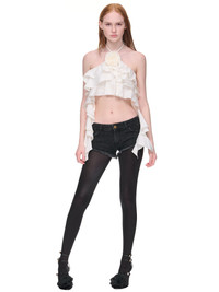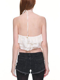 BLUMARINE top in white, flounced design, rose detail, halter neck, back cross straps, ruffled sides, open shoulders & back, cropped, fully lined. Made in Italy Italian Sizing 77% Cotton, 18% Nylon, 5% Elastane Model is 5'10" wearing size 38. Bust: 32" Waist: 24" Hip: 34"