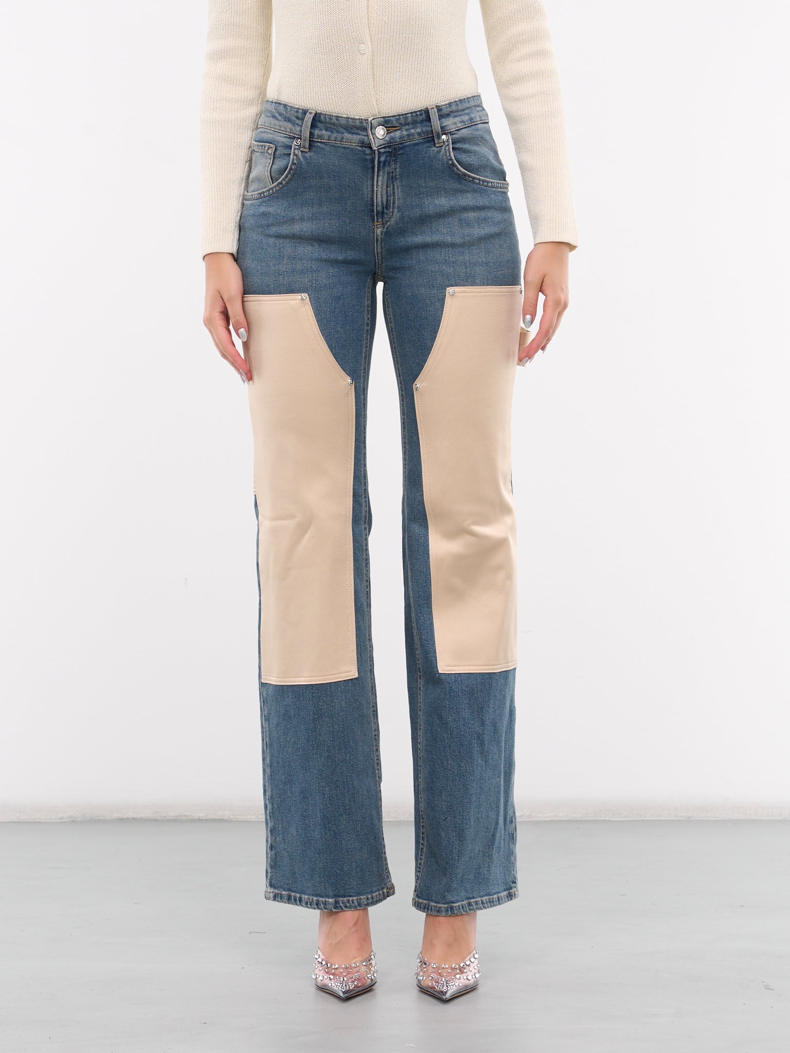 BLUMARINE pants in blue, paneled denim construction, belt loops, back logo patch, front button & concealed zip fly closure, inset pockets, coin pocket, back patch pockets, contrast satin paneling, side carpenter's loops, reinforced knee paneling, straight leg, slim fit. Made in Albania Outer: 98% Cotton 2% Elastane Contrast: 71% Acetate 27% Viscose 2% Elastane Pocket: 65% Polyester 35% Cotton European Sizing Model is 5'10" wearing size 38. Bust: 33" Waist: 23.5" Hips: 35.5"