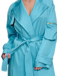 BLUMARINE coat in blue, trench design, double-breasted, notched lapel collar, concealed button & tie closure, belt loops, sleeve bellow zip pocket, back vent, lined, relaxed fit. Made in Italy Italian Sizing 71% Acrylic, 27% Viscose, 2% Elastane Model is 5'9" wearing size 38. Bust: 32" Waist: 24" Hip: 35.5"