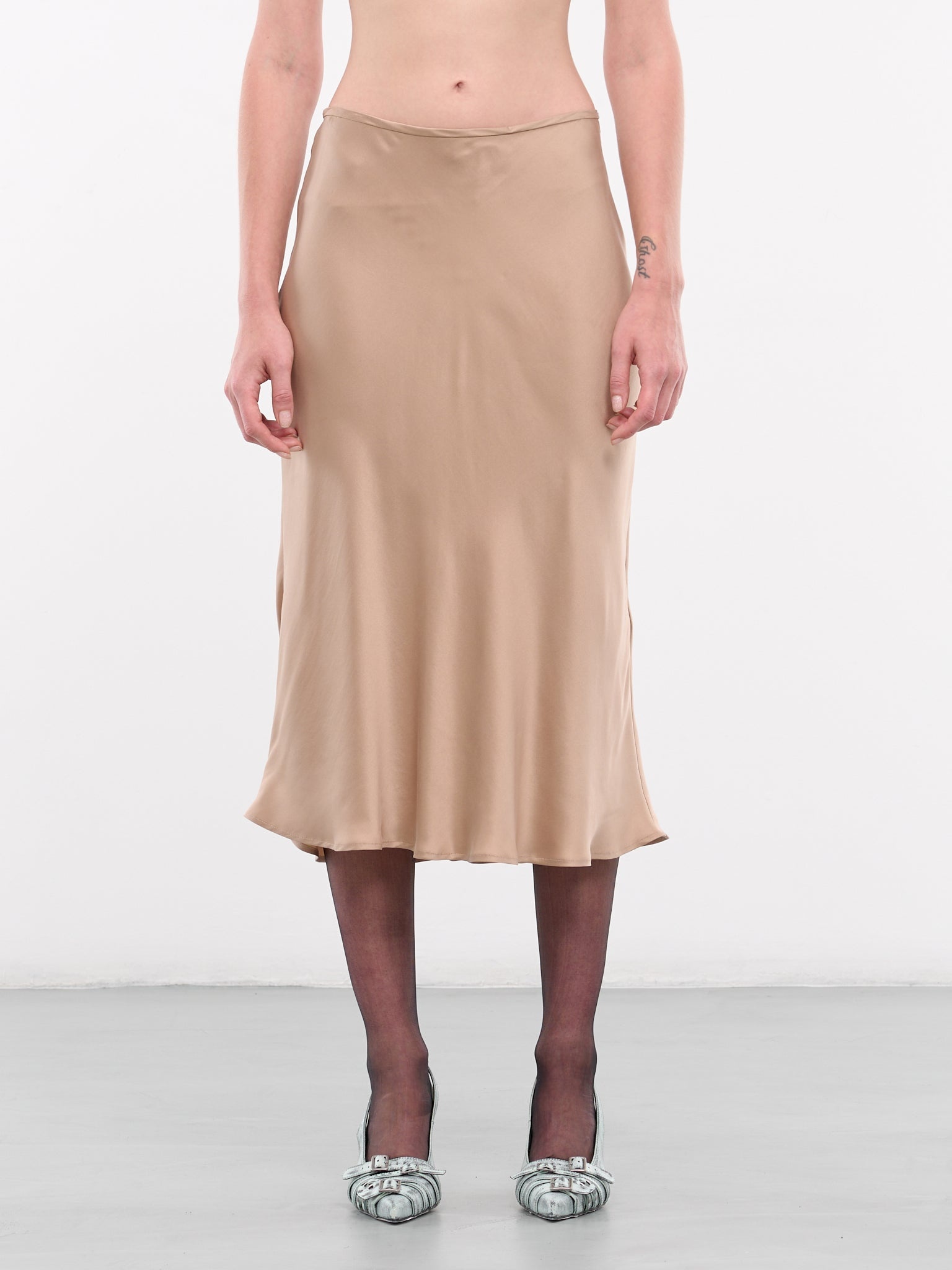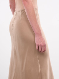 BLUMARINE skirt in beige, paneled silk construction, fitted waist, side zip closure, fluted hem, midi-length, slim fit. Made in Italy 100% Silk European Sizing Model is 5'8" wearing size 40. Bust: 31" Waist: 23.5" Hips: 34"