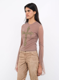 BLUMARINE t-shirt in brown, studded cross detailing, tulle construction, semi-sheer, crewneck, long sleeves, slit flared cuffs, rounded hem, slim fit. Italian Sizing 82% Nylon, 18% Elastane Model is 5'10" wearing size 40. Bust: 32" Waist: 25" Hips: 35"