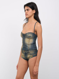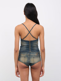 BLUMARINE top in blue, bodice design, shaped bra, denim construction, embroidery studs, square neckline, spaghetti straps, cross back, zip closure, slight crop, fitted. One Size 98% Cotton, 2% Elastane Model is 5'10" wearing size OS. Bust: 32" Waist: 25" Hips: 35"