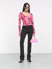 BLUMARINE bodysuit in pink, paneled jersey construction, torchon rose print, semi-sheer, scoop neck, elongated sleeves, mid-cut, form fit. Made in Italy 90% Polyamide 10% Elastane European Sizing Model is 5'8" wearing size 38. Bust: 32" Waist: 26" Hips: 34.5"