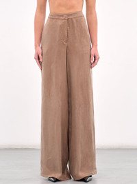 BLUMARINE pants in brown, paneled construction, high waist, front concealed zip fly closure, back metal logo plaque, side pockets, wide leg, loose fit. Italian Sizing Model is 5'8.5" wearing size 40. Bust: 32" Waist: 24" Hips: 34"