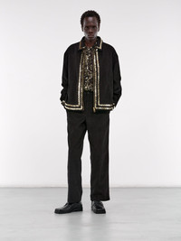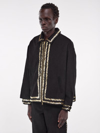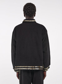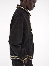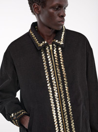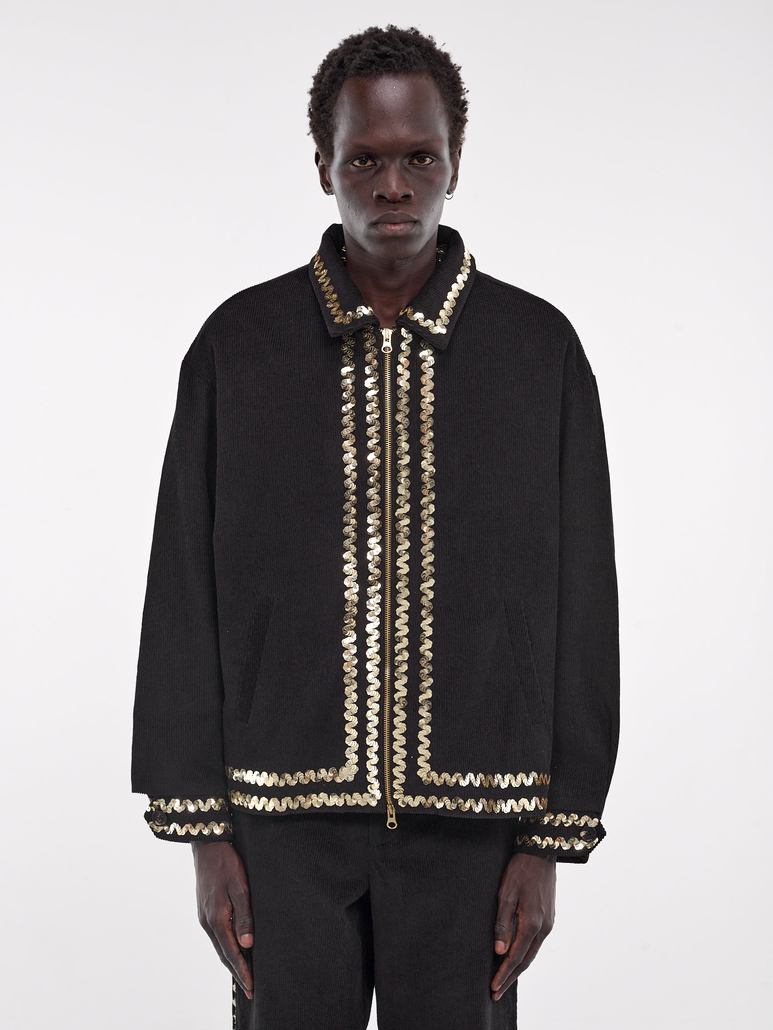 BODE jacket in black, paneled corduroy construction, hem sequin embellishment throughout, spread collar, front exposed two-way zip closure, long sleeves, button cuffs, straight hem, relaxed fit. Made in India 100% Cotton Standard Sizing Model is 5'11.5" wearing size L. Shoulders: 16" Chest: 32.5" Waist: 30"