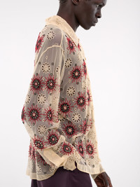 BODE shirt in ecru, paneled nylon construction, sheer, graphic flower cut-outs & embroidery, spread collar, front button-loop closure, long sleeves, button cuffs, straight hem, relaxed fit. Made in US 100% Nylon Standard Sizing Model is 5'11.5" wearing size L. Shoulders: 16" Chest: 32.5" Waist: 30"