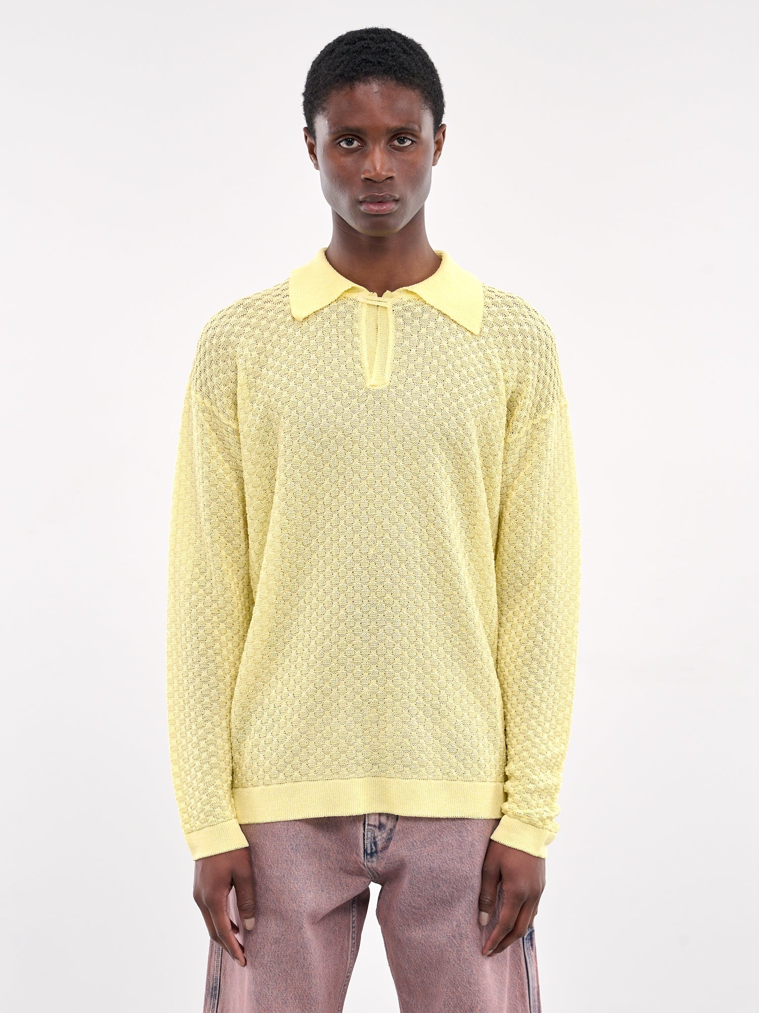BONSAI polo in yellow, paneled knit construction, jacquard knit pattern, spread collar, loop-button fastening, quarter placket, long sleeves, rib-knit cuffs & hem, straight hem, relaxed fit. Standard Sizing Model is 6'1" wearing size M. Shoulders: 15.5" Chest: 31" Waist: 26"