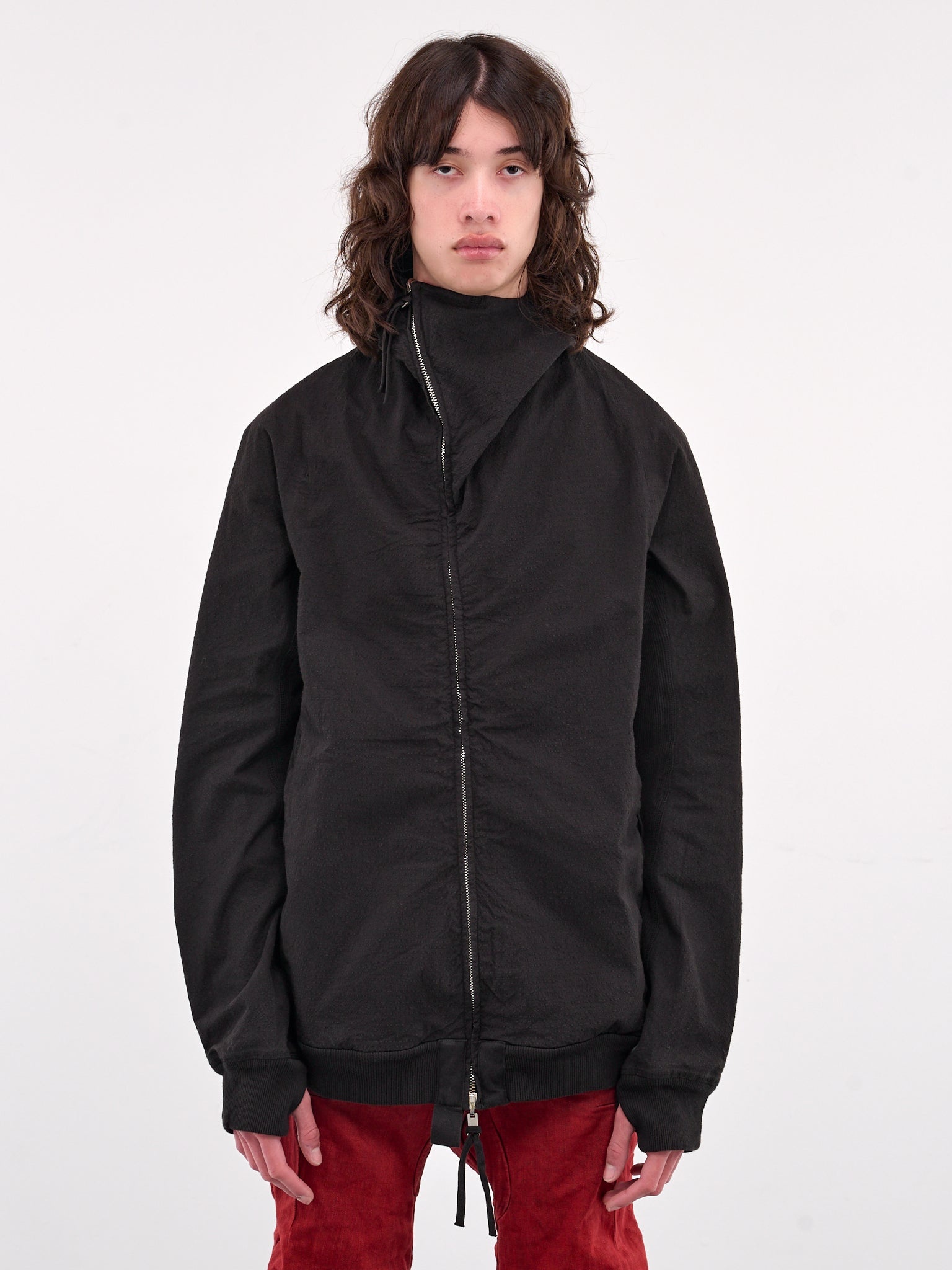 BORIS BIDJAN SABERI jacket in black, paneled stretch cotton construction, hood, high neck, off-set concealed two-way zip closure, elongated sleeves, rib-knit cuffs & hem, thumbholes, straight hem, relaxed fit. Made in Spain Fabric 1: 95% Cotton 5% Polyurethane Fabric 2: 100% Cotton Standard Sizing Model is 6'0" wearing size L. Shoulders: 18" Chest: 36" Waist: 30"