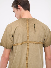 BORIS BIDJAN SABERI brown t-shirt, handcrafted, cotton jersey, over-dyed rib crewneck, rolled edge cuffs & hem, back signature drawstring & cross-stitch detail, full length, relaxed fit. Made in Spain Standard Sizing 100% Cotton Model is 6’2” wearing size M. Shoulders: 19” Chest: 38” Waist: 28”