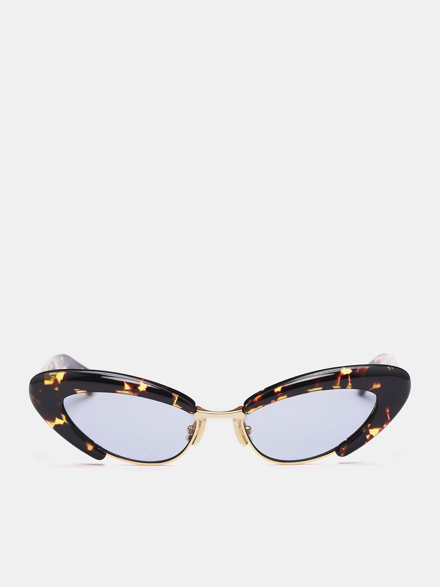 BOTTEGA VENETA sunglasses in brown & navy, acetate construction, tortoiseshell style pattern, cat-eye frame design, angled frames, adjustable nose pad, blue-tinted lenses, temple gold-tone hardware, case included. Made in Japan Acetate & Polyamide One Size