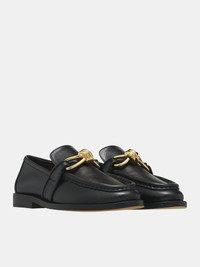 BOTTEGA VENETA shoes in black, loafer design, paneled leather construction, low-top, slip-on style, loafer-style vamp, gold-tone signature metallic knot detailing, block heel, leather sole & logo debossing, lined. Made in Italy Outer: 100% Calfskin Inner: 100% Calfskin European Sizing